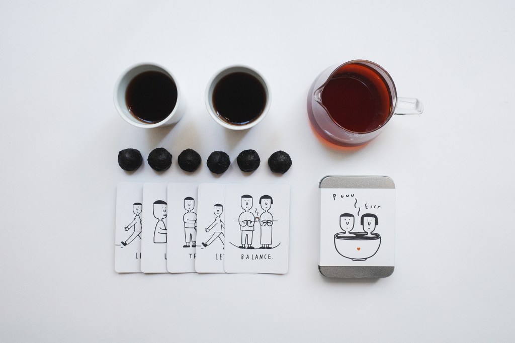 這兩年在香港,有一種就算你再努力也不能改變的超強低氣壓,我們希望可以做些事,令身邊的人心暖一暖。Camille 就畫了一系列插畫卡,讓人一邊飲茶,一邊細味卡片的寓意。我們試了很多款茶,最終在上環一間茶廠覓得這款口感不錯的普洱小沱。