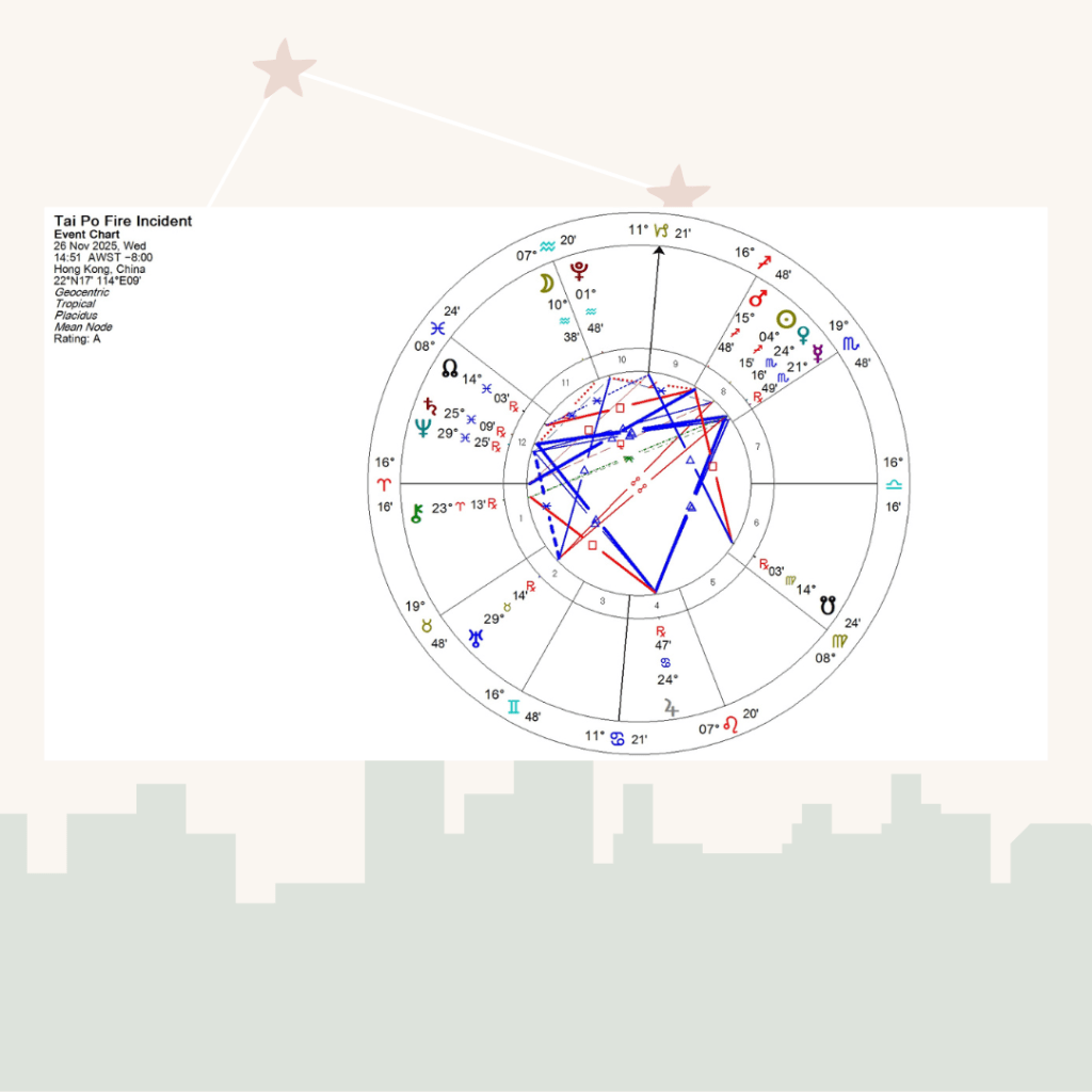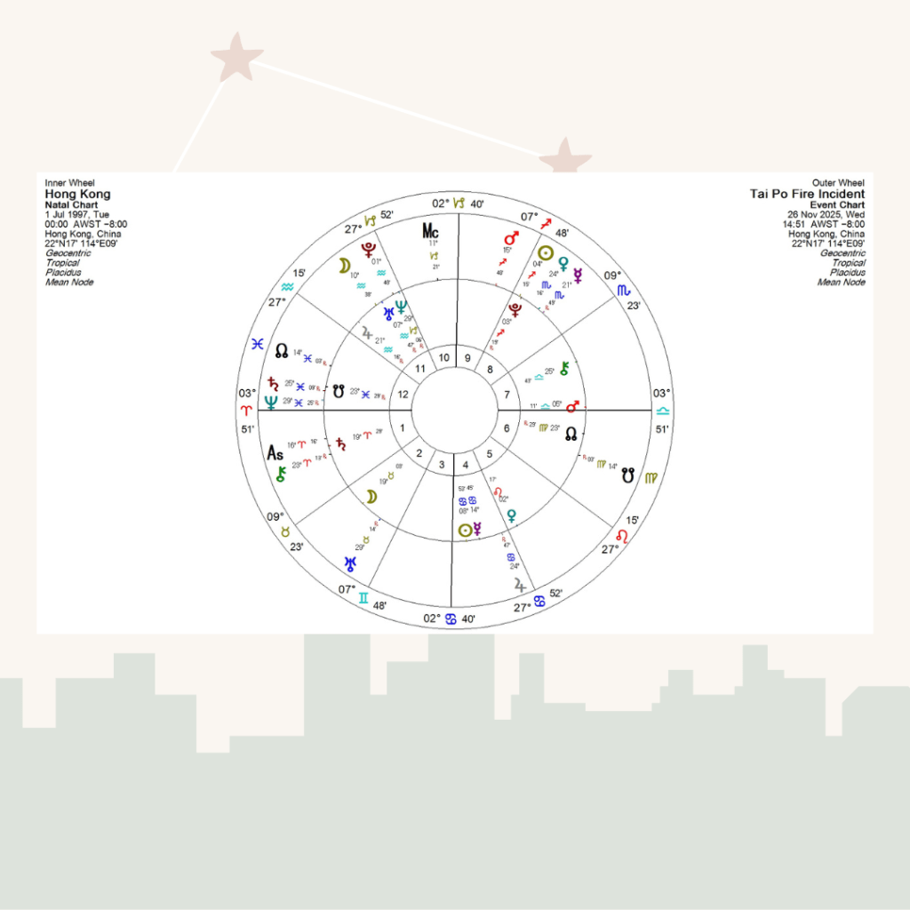 那麼,這件事對香港人有甚麼啟發?從香港整體發展角度看,香港自2025年6月進入緊密的月交點軸對沖(Nodal Opposition),香港本命南交點在雙魚座,北月交點在處女座(而現在天空則是北月交點在雙魚、南月交點在處女,完全對調)。月交點象徵一個地方的靈魂路徑,南月交在雙魚傾向以信念、想像力、主觀情緒去處理問題,當月交點雙魚被啟動,一個地方明顯會出現集體迷惘、恐慌、資訊失實,浮現災難、慈善的主題。月交點軸「調轉」是強烈的訊號:舊模式會被迫浮面,而制度改革的需求會變得迫切;包括建立透明度、強化制度、監察、法律框架,減少神話式、宣傳式話語,回歸實證、數據化、專業化的路向。